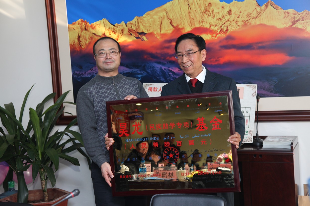 马永昇总裁向云南民族文化发展基金会赠送“昊龙民族助学专项基金”首期捐款牌证
