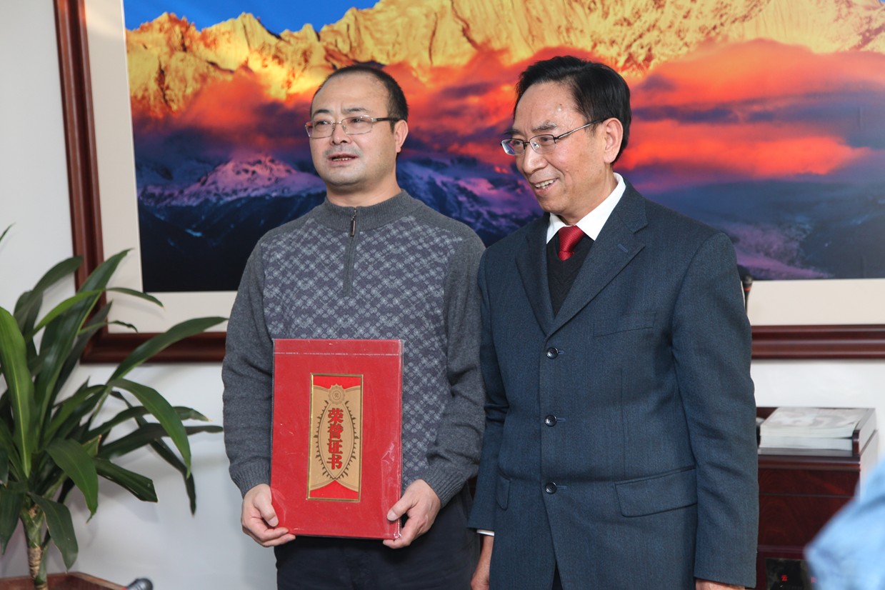 云南民族文化发展基金会王天玺理事长向集团颁发六百万元“昊龙民族助学专项基金“一百万元首期捐款荣誉证书